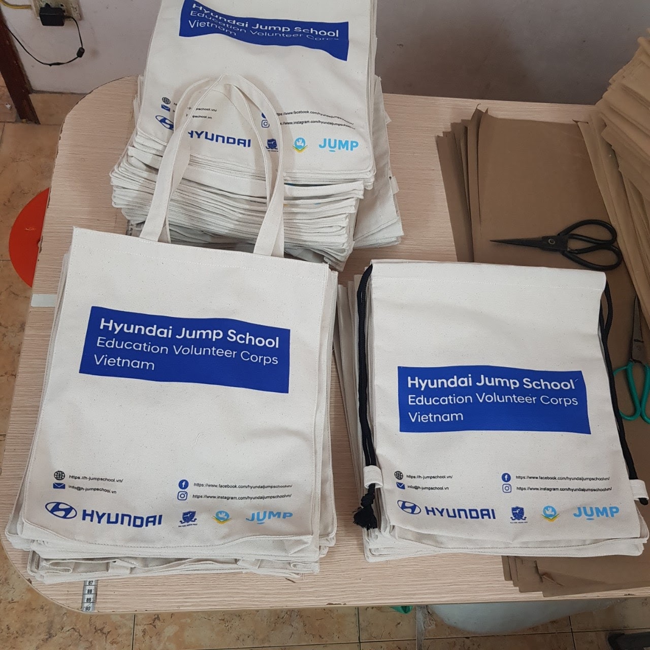 Trong các chiến dịch cộng đồng và giáo dục, Hyundai Việt Nam đã lựa chọn túi vải canvas in logo để làm quà tặng cho dự án Hyundai Jump School – Education Volunteer Corps Vietnam. Đây là dòng túi được in ấn với thiết kế hiện đại, logo nổi bật, phù hợp để sử dụng trong các chương trình thiện nguyện, đào tạo và hoạt động CSR.