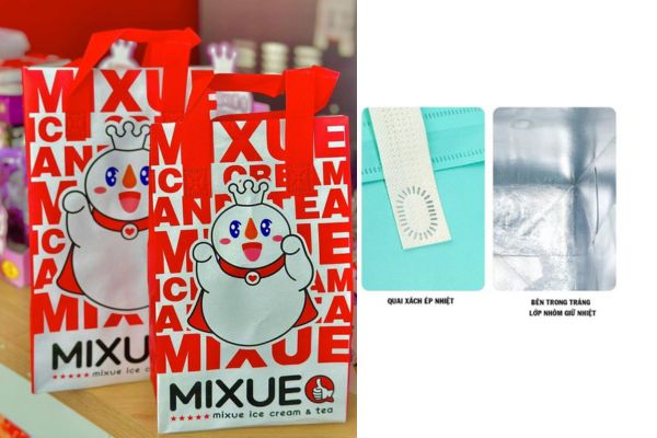 Túi vải không dệt giữ nhiệt thường được dùng để giữ nóng, giữ lạnh cho các loại thực phẩm. Đây là sản phẩm được làm bằng công nghệ ép nhiệt với 3 lớp, bên ngoài là lớp vải cán màng mờ có khả năng in ấn logo và hình ảnh theo yêu cầu, tạo sự thẩm mỹ và nhận diện thương hiệu. Lớp vải này gọn nhẹ và chịu lực tốt. Bên trong là lớp vải không dệt thân thiện với môi trường. Và lớp trong cùng là lớp màng nhôm giữ nhiệt tối ưu, giúp bảo quản nhiệt độ của nước trong ly, từ đó duy trì được chất lượng thực phẩm tốt nhất cho người sử dụng.