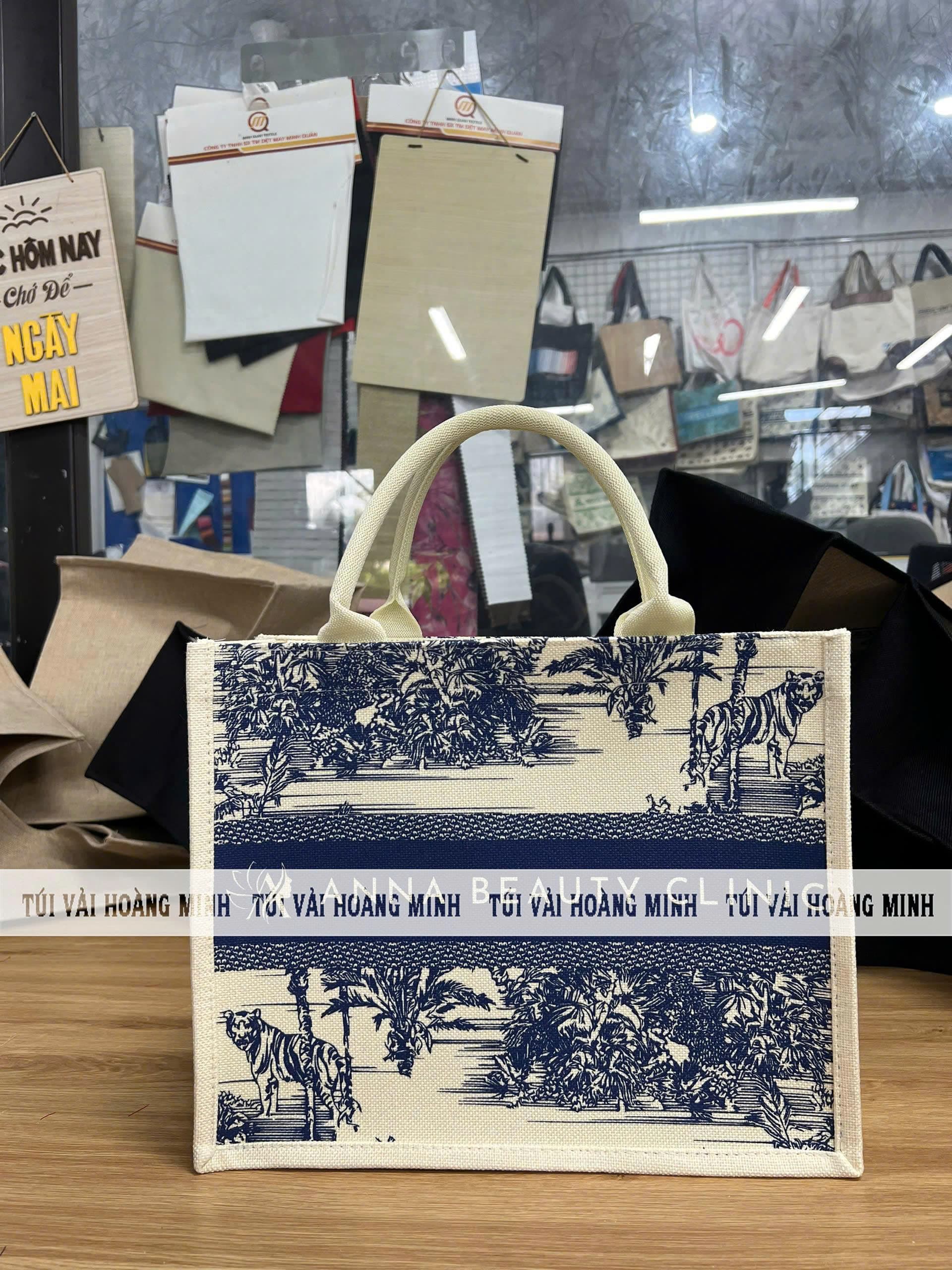Họa tiết in độc đáo: Điểm nhấn nổi bật nhất của chiếc túi này chính là họa tiết in chìm tinh xảo. Họa tiết màu xanh cobalt trên nền vải trắng kem là sự kết hợp hoàn hảo, mang đến vẻ đẹp cổ điển nhưng không kém phần hiện đại. Hình ảnh những chú hổ dũng mãnh và khung cảnh rừng rậm nhiệt đới được khắc họa một cách tỉ mỉ, tạo nên một câu chuyện đầy nghệ thuật trên từng thớ vải. Chiếc túi không chỉ là phụ kiện mà còn là một tác phẩm nghệ thuật di động, giúp bạn thể hiện gu thẩm mỹ tinh tế của mình.