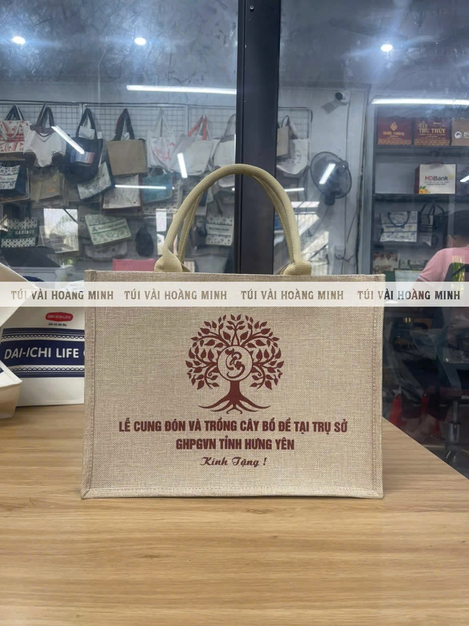 Trong Lễ cung đón và trồng cây Bồ Đề tại trụ sở GHPGVN tỉnh Hưng Yên, túi linen đay đã được sử dụng làm quà tặng cho khách tham dự. Với màu sắc trang nhã và logo in sắc nét, sản phẩm trở thành món quà đầy ý nghĩa, đồng thời để lại dấu ấn lâu dài về sự kiện.