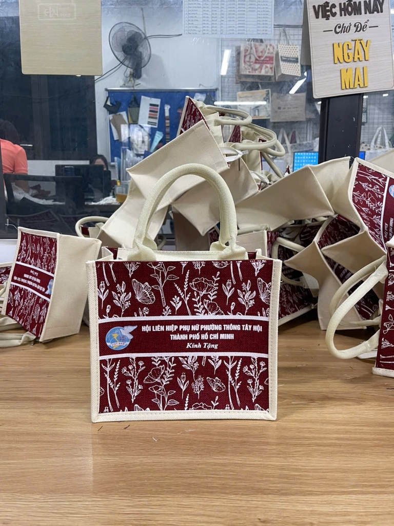 Túi vải linen in logo của Hội Liên Hiệp Phụ Nữ cùng họa tiết hoa văn nhẹ nhàng, tạo nên sự kết hợp hài hòa giữa tính thẩm mỹ và sự chuyên nghiệp. Đây là món quà không thể thiếu trong các hoạt động, sự kiện của tổ chức, đồng thời cũng là món quà ý nghĩa dành tặng cho những người tham gia, thể hiện sự quan tâm và tôn trọng từ tổ chức.