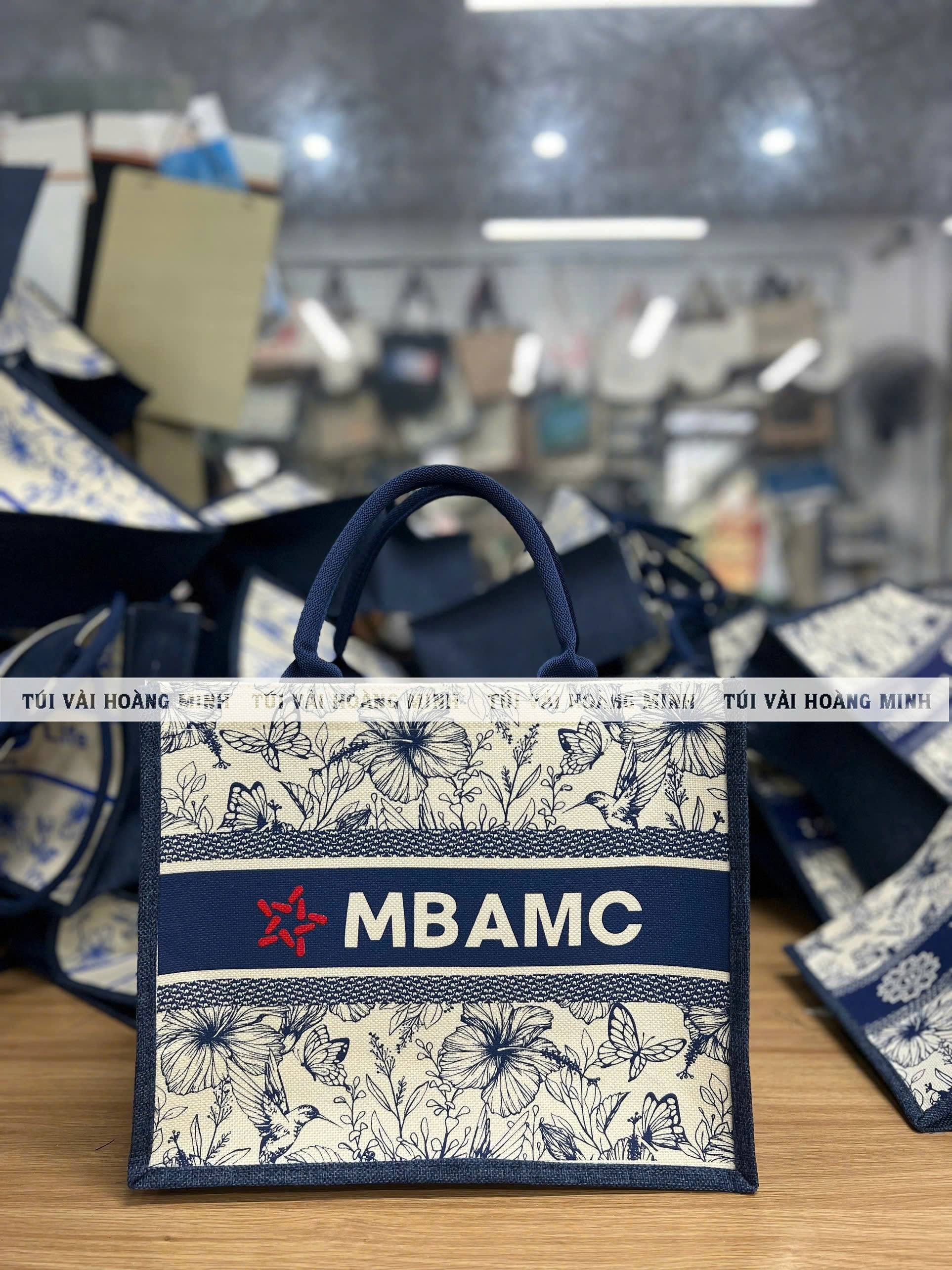 Mẫu túi vải linen cao cấp từ xưởng may túi Hoàng Minh – được thiết kế riêng cho MBAMC làm quà tặng thương hiệu với họa tiết thiên nhiên tinh tế, phối màu xanh sang trọng và khả năng in logo sắc nét tạo sự sang trọng, bền vững và thân thiện với môi trường.