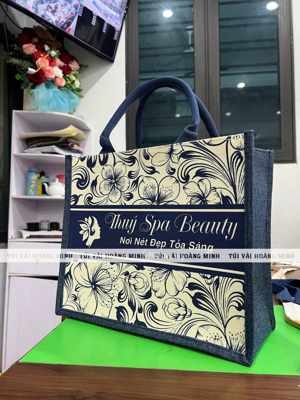 Mặt túi được in hoa văn nghệ thuật phối họa tiết floral vintage, kết hợp với logo “Thủy Spa Beauty – Nơi Nét Đẹp Tỏa Sáng” được in sắc nét ở trung tâm. Đây không chỉ là một chiếc túi tiện lợi mà còn là công cụ truyền thông thương hiệu đầy ấn tượng.