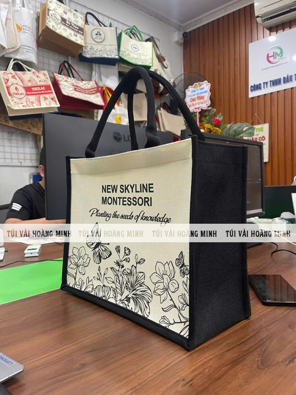 Màu sắc và họa tiết: Chiếc túi gây ấn tượng với sự kết hợp hài hòa giữa màu linen tự nhiên (màu be nhạt) và màu đen tuyền của quai xách và phần đáy túi. Điểm nhấn đặc biệt nằm ở họa tiết in sắc nét và tinh xảo ở mặt trước. Dòng chữ "NEW SKYLINE MONTESSORI" và "Planting the seeds of knowledge" cùng hình ảnh những bông hoa và cánh bướm được vẽ cách điệu, mang đậm phong cách nghệ thuật, tạo nên sự khác biệt và thu hút.
