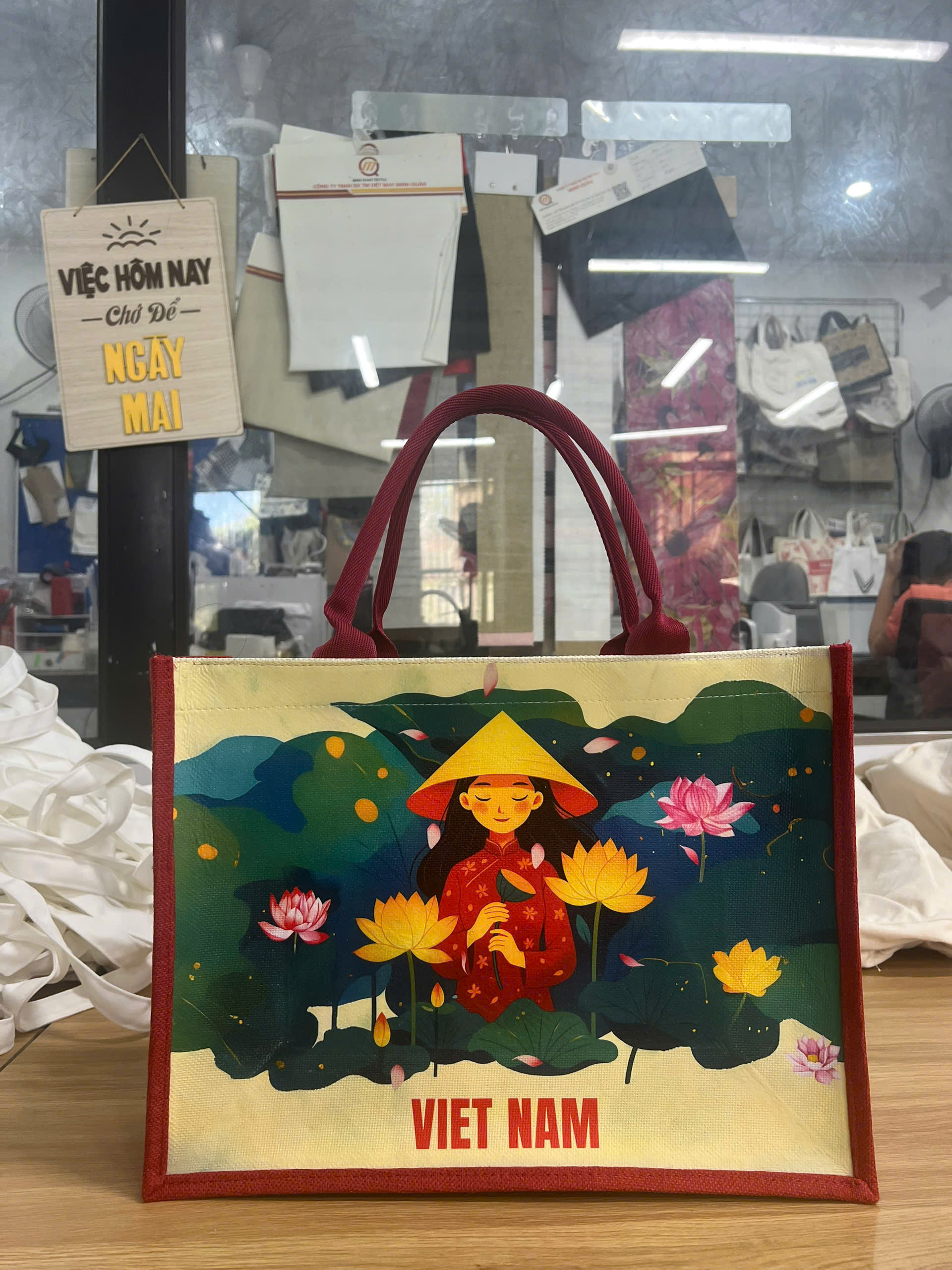 Túi vải linen in hình Việt Nam là sự kết hợp tinh tế giữa chất liệu tự nhiên bền bỉ và thiết kế đậm chất văn hóa dân tộc. Với hình ảnh cô gái mặc áo dài truyền thống bên hoa sen – biểu tượng thanh cao, thuần khiết, chiếc túi không chỉ đơn thuần là vật dụng đựng đồ, mà còn mang giá trị thẩm mỹ và thông điệp ý nghĩa về đất nước, con người Việt Nam.